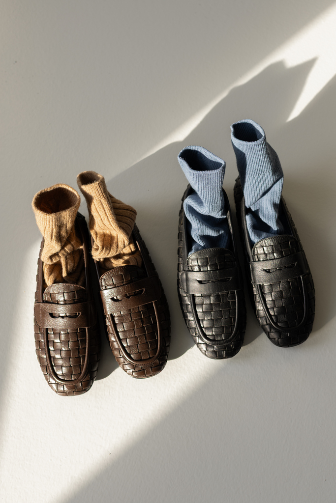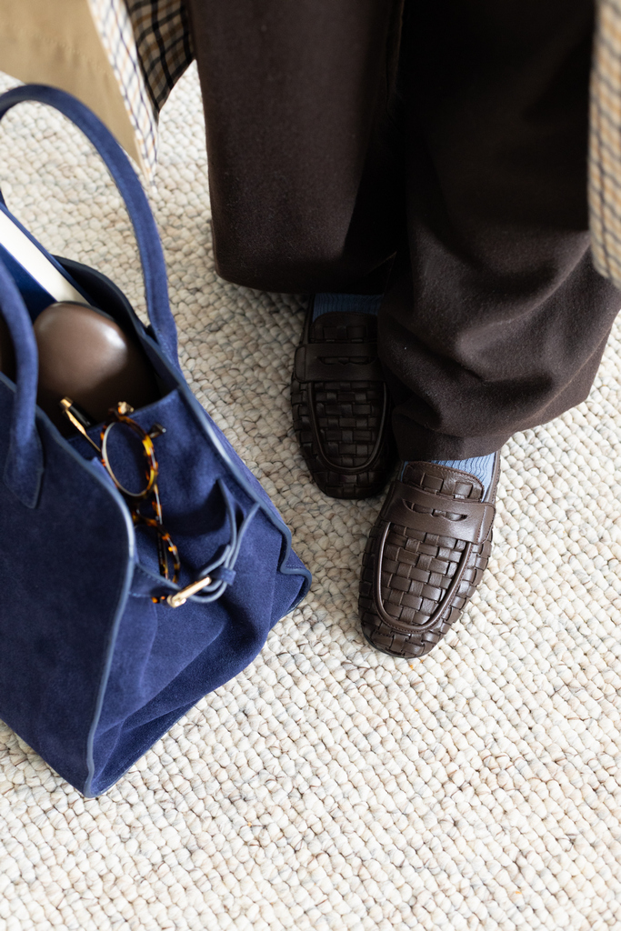 MASTERY OF WEAVE AND TEXTURE: The dominant feature of the collection is hand-braiding, giving three-dimensionality to loafers, sandals, and spacious shoppers. Alongside it, luxurious suede with velvety softness appears, as well as unique embossings (e.g., ostrich pattern), celebrating the richness of textures.