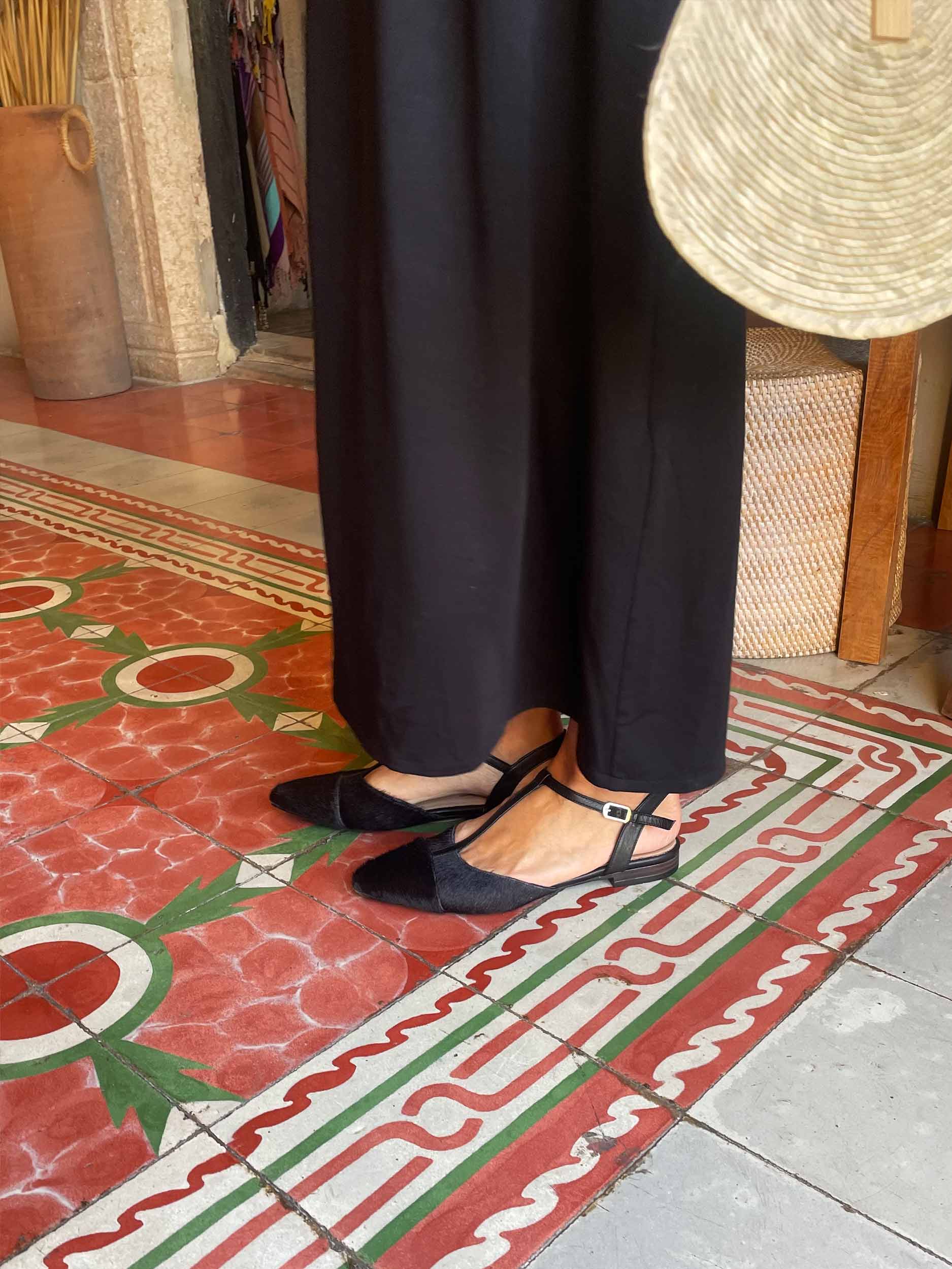 T-bar sandals with a closed toe, crafted from leather and cowhide with hair