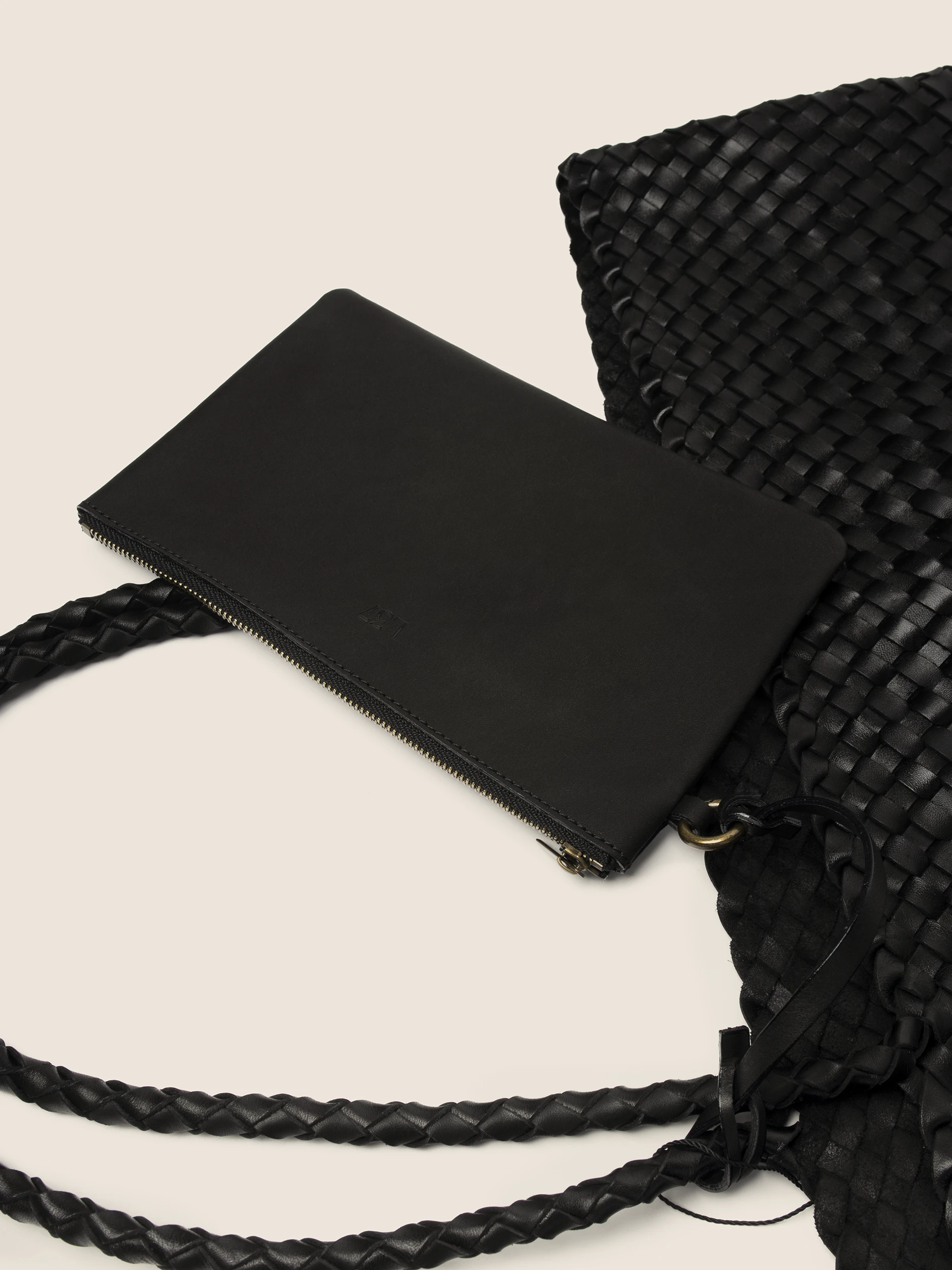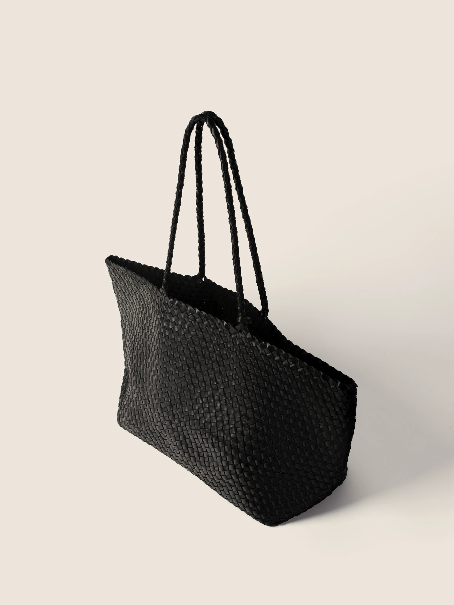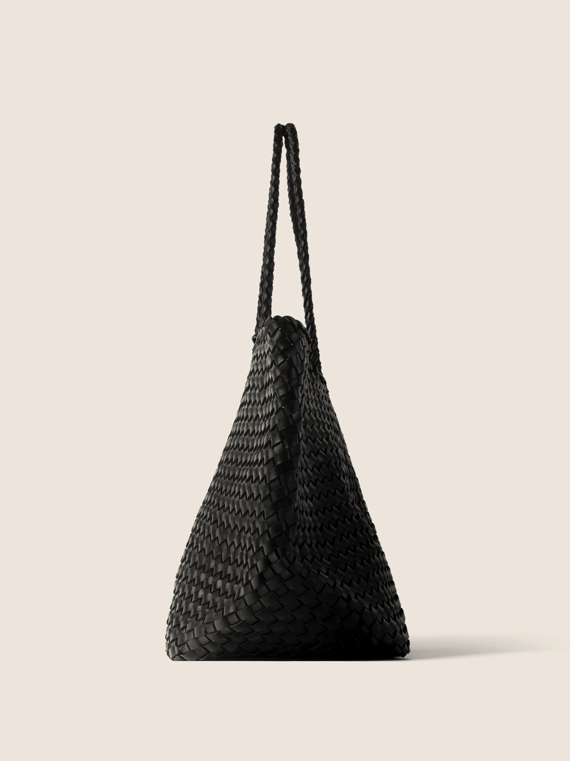 • Braided Handles: Long, braided black handles with a braid structure allow for comfortable carrying of the bag on the shoulder, providing stability and comfort.