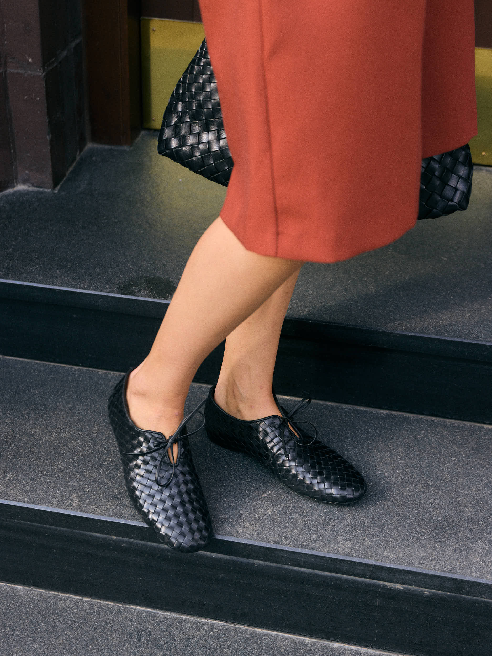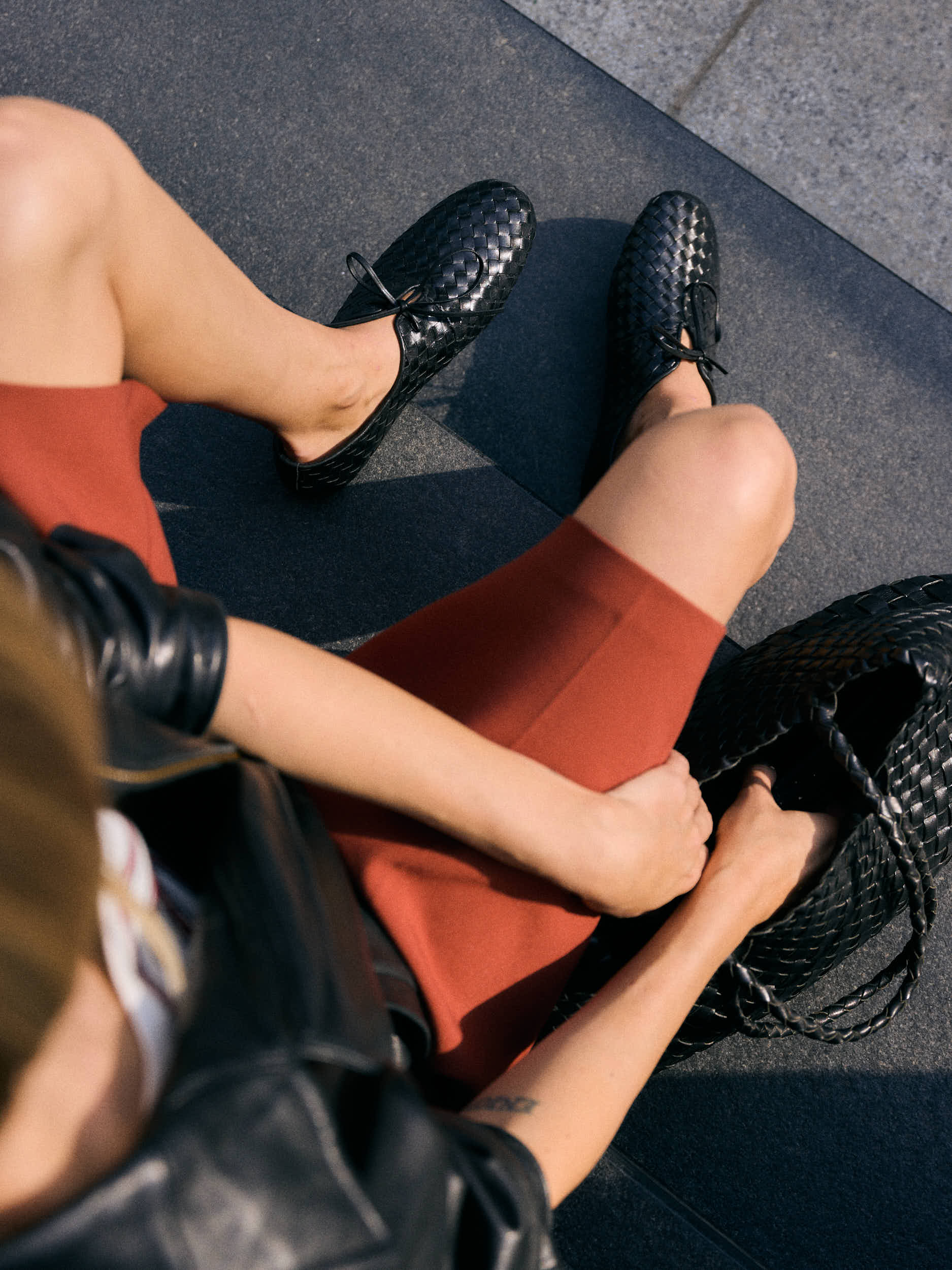 INTRICATE WEAVE IN A LACED FORM The SUNLIGHT ON MY SKIN model is a proposal for women who seek something more in fashion than standard solutions. These black shoes combine the lightness of a ballerina with the character of classic, laced footwear. Their strongest point is the intricate structure of the woven leather, which makes the shoes a jewelry-like completion to any styling, while maintaining a raw, modern look.