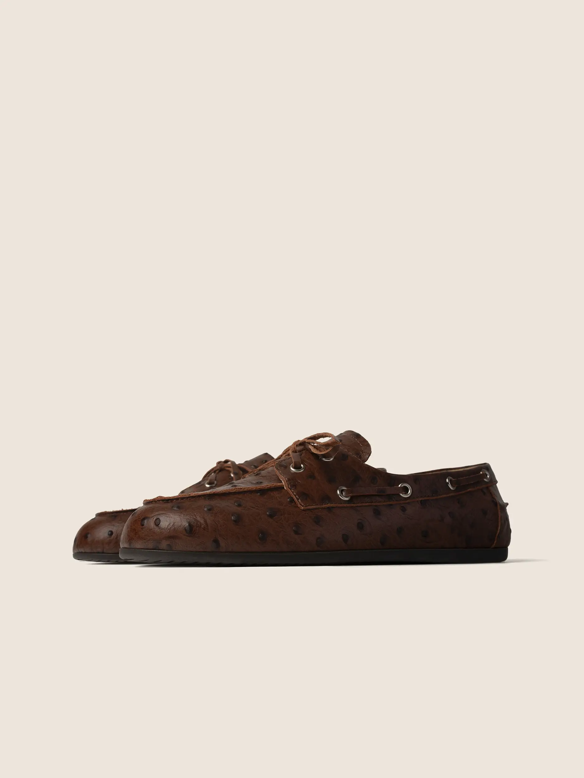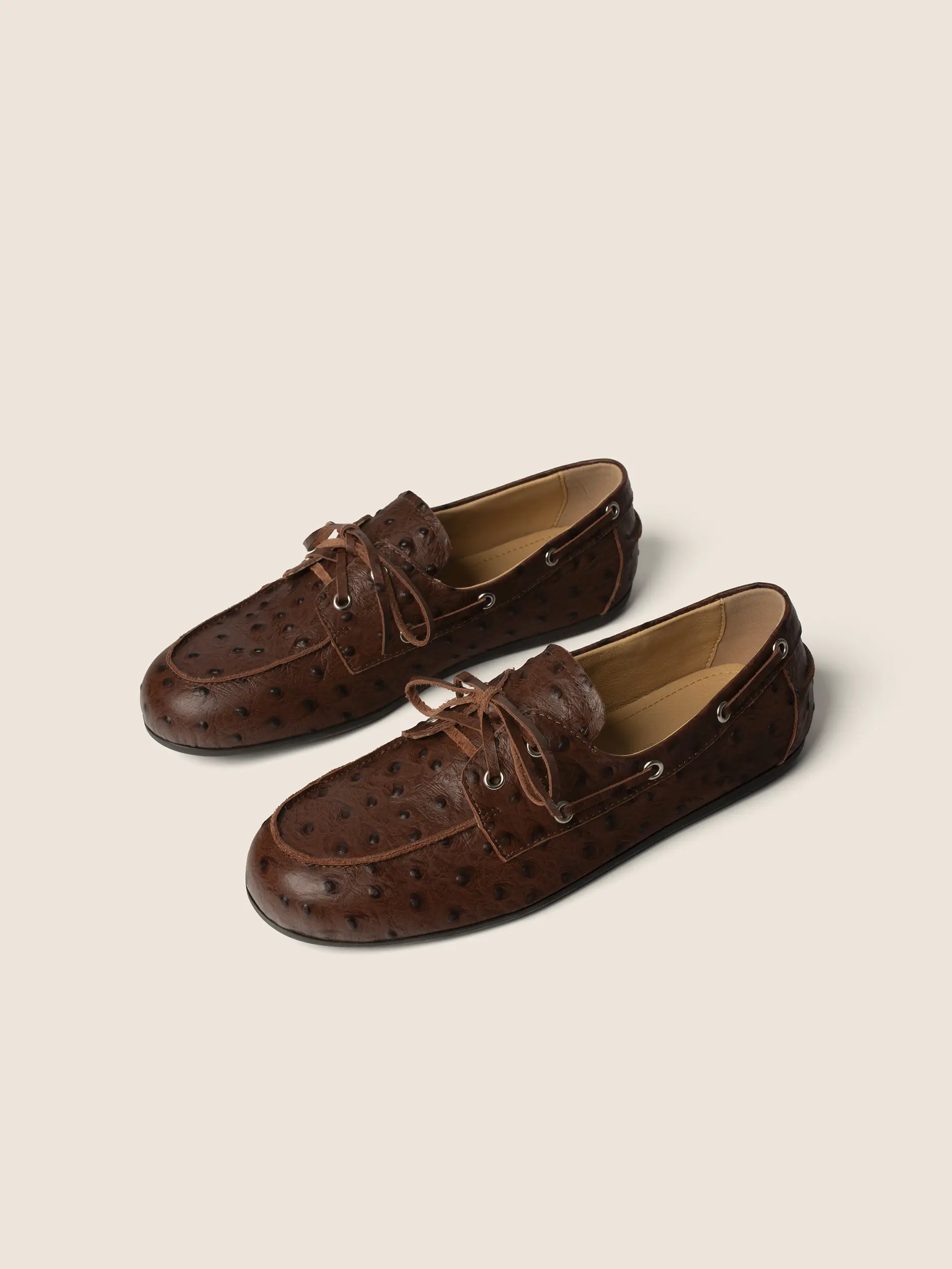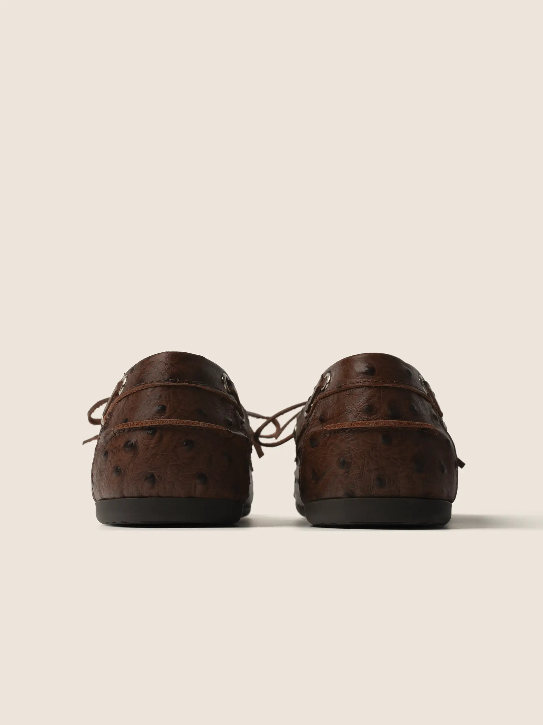 BRĄZOWE SKÓRZANE MOKASYNY Z TŁOCZENIEM WZORU STRUSIA