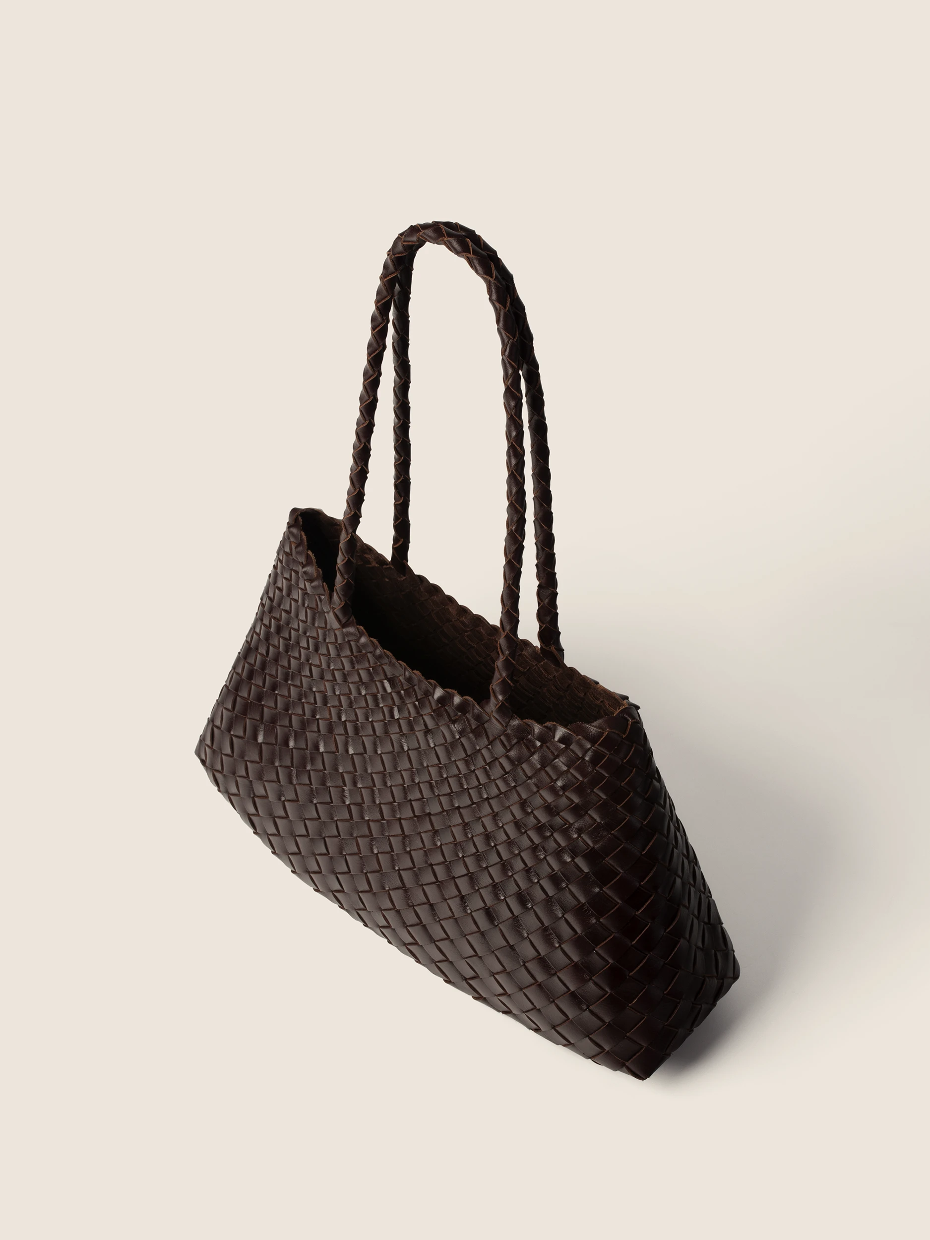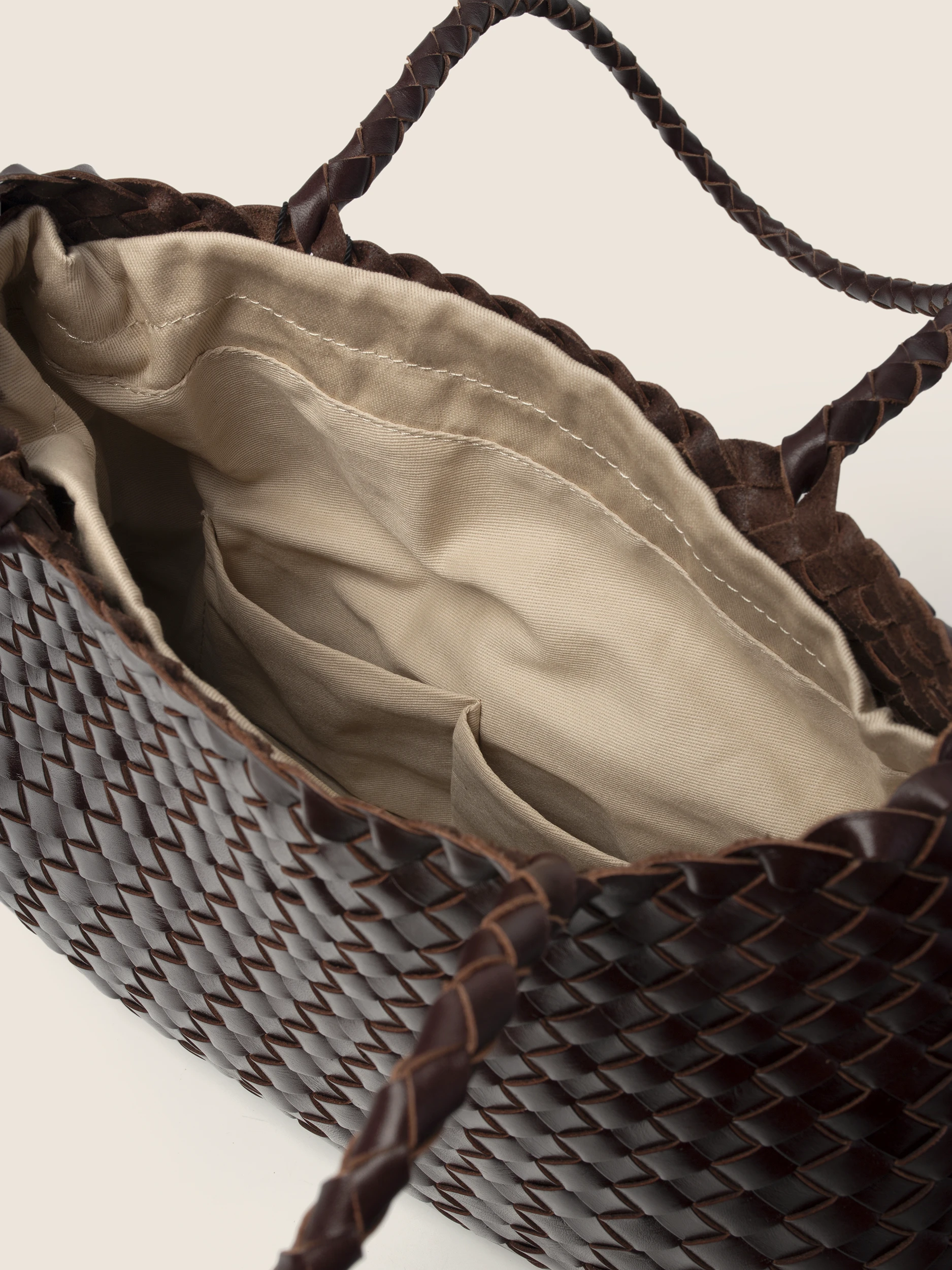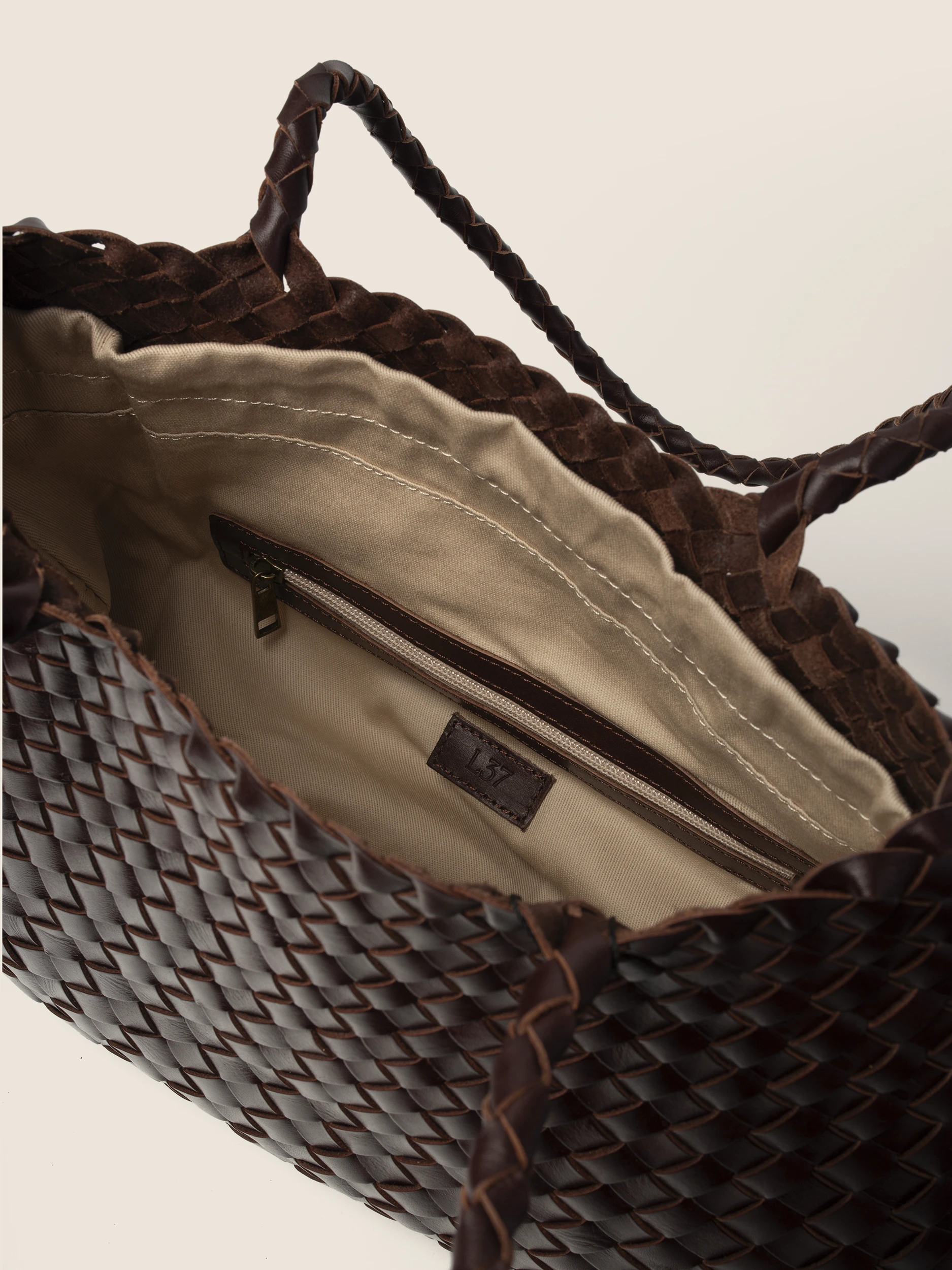 • Ekskluzywna Pleciona Skóra: Cała powierzchnia torby to efekt precyzyjnego, ręcznego przeplatania pasm naturalnej skóry w kolorze gorzkiej czekolady. Ta pracochłonna technika gwarantuje unikalność i niezwykłą trwałość każdego egzemplarza.