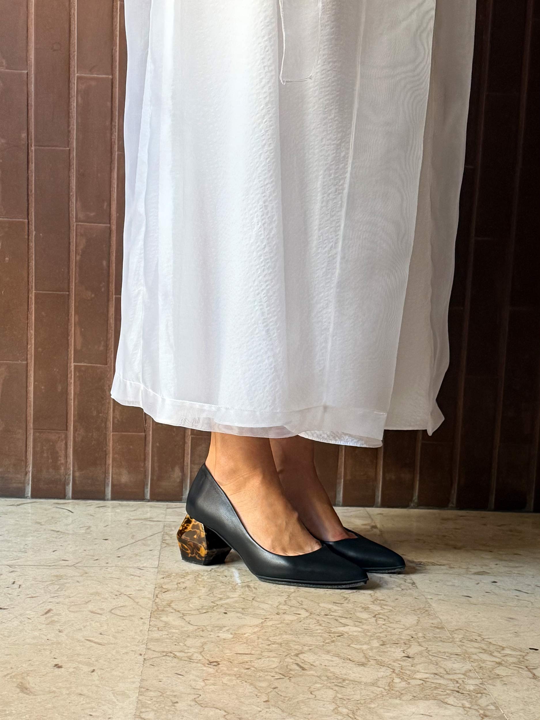 skórzane czółenka na geometrycznym obcasie