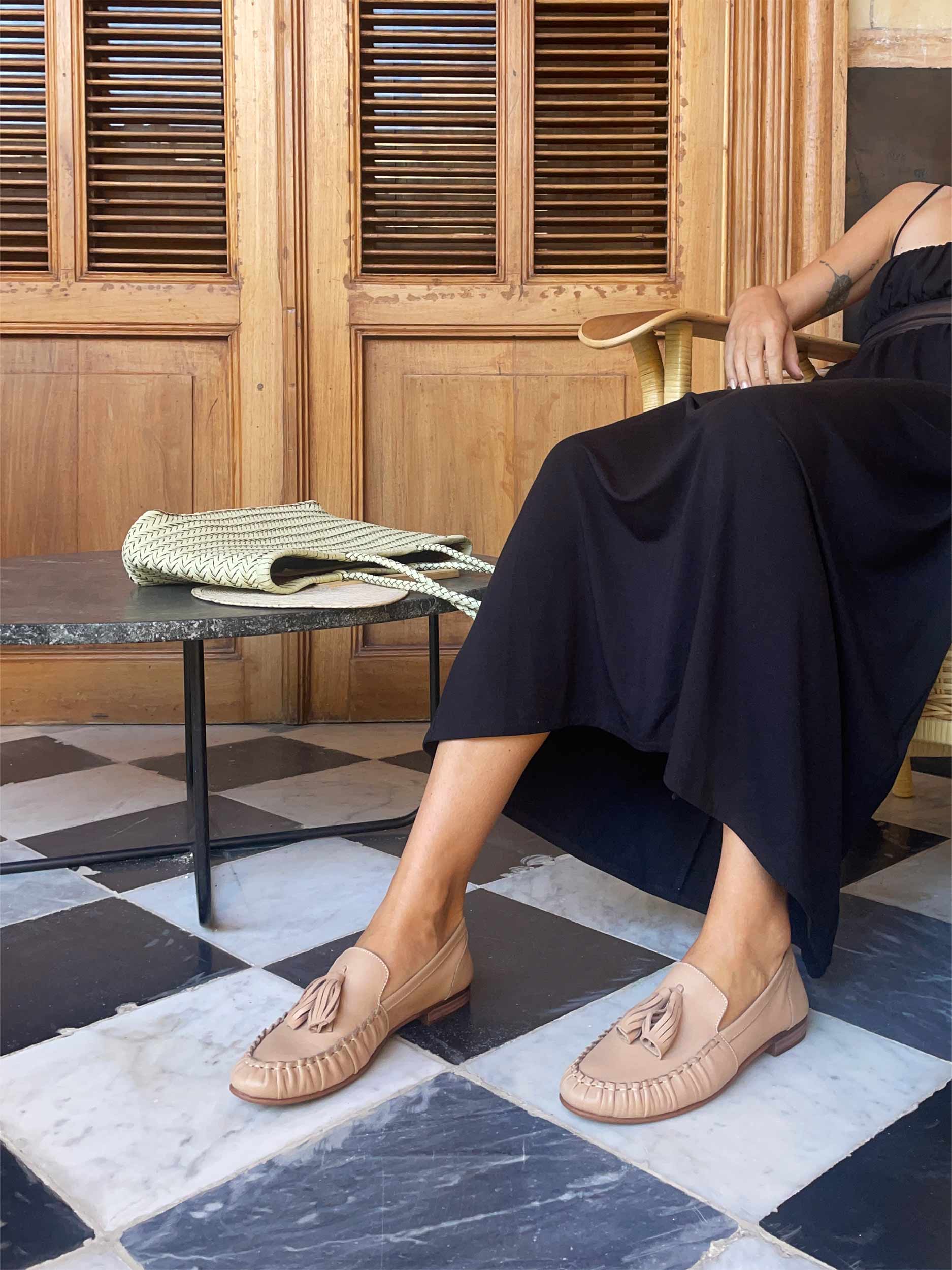 Beżowe mokasyny z chwostami i rzemieślniczym marszczeniem
